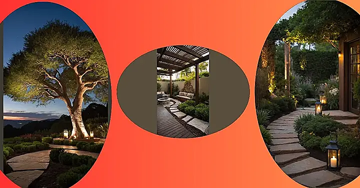You can definitely ditch the regular backyard swing, because this garden nook is about to become your new favorite spot! Just check out that giant tree, all lit up from below like it’s ready to share the secrets of the universe – or at least, give off some super chill vibes. With those cool lights making its leaves glow like a natural, leafy disco ball, it’s practically waving you over to come hang out. The winding stone path through the neat little bushes looks like it’s leading straight to the best hidden chill zone in town.