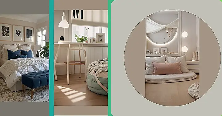 This bedroom is seriously goals! Just look at that fluffy rug – it’s like walking on a cloud! And the bed? So comfy and stylish it practically screams “nap time.” With its neutral colors and soft textures, this room is perfect for anyone who loves a calm and cute space. Imagine yourself relaxing in this room after a long day of school, or having your friends over for a chill sleepover— pure perfection! Those pictures on the wall add just the right touch of fancy without being too overwhelming. This is definitely the kind of “cute room” you’d want to show off on your social media!
