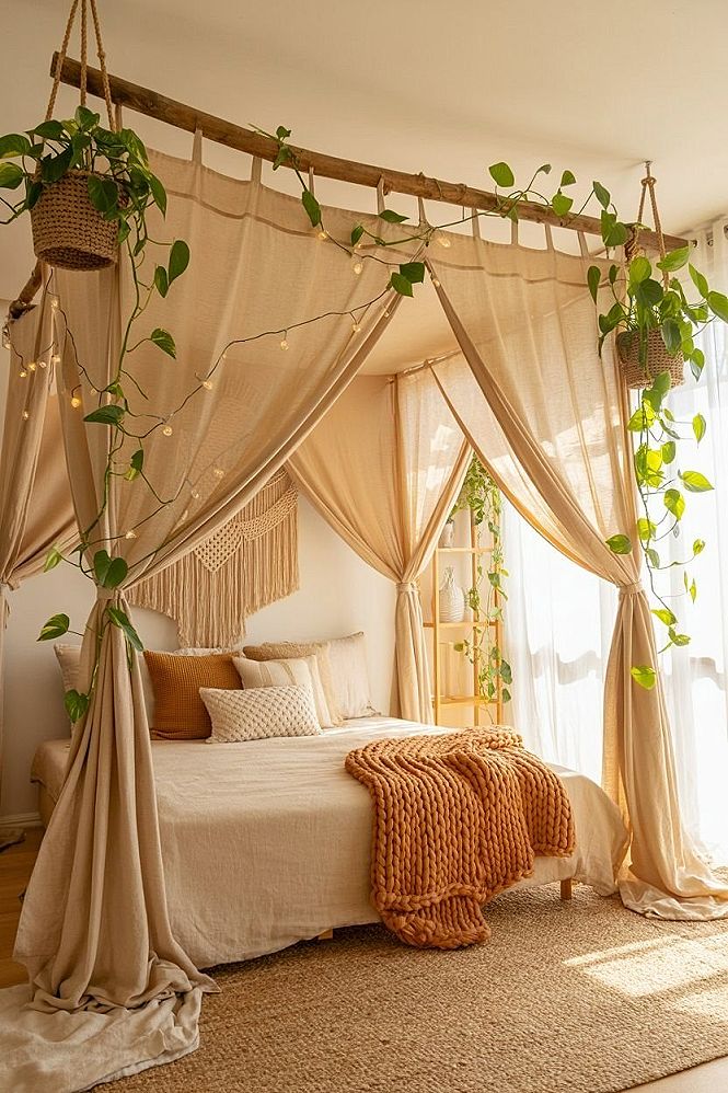 #1 Dreamy Canopy Bedroom: Enchanting Boho Sanctuary with Plants
