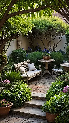 This courtyard garden looks like the coolest hideout ever, like you’ve just stepped through a magic portal into a secret Italian spot perfect for escaping literally anything. Forget homework or chores, this bench with its comfy pillows is practically begging you to sit down and do absolutely nothing important. The plants are all lush and green, looking like they’re just soaking up the sun and having a grand old time, completely unbothered by real-world problems. It feels like the kind of place where time slows down, and the only thing on the agenda is deciding if you need another glass of lemonade.
