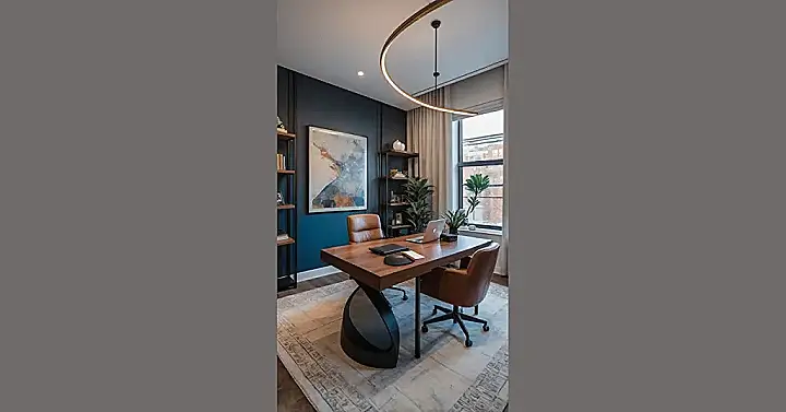 Step into this amazing cozy private office, a space so inviting you might actually *want* to tackle that mountain of homework here! This isn’t your average desk-and-chair setup; it’s more like a secret hideout for getting stuff done, or, you know, just chilling in style. That epic live-edge desk looks like it was custom-made by a magical tree, providing ample room for all your textbooks, your laptop, and maybe even a secret stash of snacks. The warm glow from that super cool globe chandelier makes the whole room feel like a giant, comforting hug, perfect for focusing… or perhaps just dreaming up your next brilliant idea (or dodging your chores).