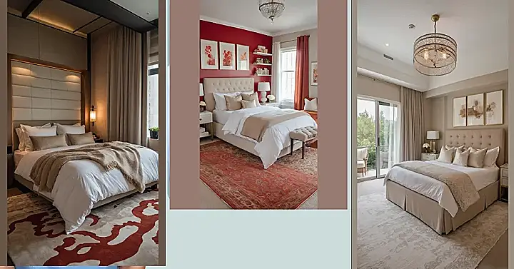 This room is practically begging for a rom-com moment, isn’t it? With that stunning deep red wall setting the mood, and a bed so fluffy it looks like you’d melt right into it, this isn’t just a place to crash – it’s a whole romantic experience waiting to happen. Those soft, warm colors from the rug to the drapes just hug you, and those elegant lamps give off the perfect dreamy glow. Honestly, it looks so put-together and inviting, you can almost hear the soft music playing in the background. It’s got “cozy night in” written all over it, maybe even “fancy dinner date at home” if you’re feeling ambitious!