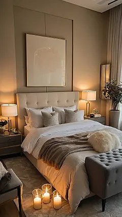 Check out this bedroom! It’s basically a giant, comfy hug wrapped in a room. You’ve got that super soft bed looking like a cloud, piled high with enough pillows to build a fort, and a throw blanket just begging you to snuggle up. The lighting from those cool lamps and the glowing candles on the floor makes everything feel extra peaceful and fancy, like you’ve walked into a chill-out zone designed by a relaxation expert. This spot is definitely serving up major cozy vibes, making it the perfect setting for a quiet evening… or, you know, for pretending you’re in a romantic comedy that’s just a few rose petals short of a grand gesture!