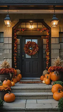This picture shows a beautiful fall-themed porch that’s guaranteed to get you in the spirit of the season! It’s like a pumpkin patch exploded right on the front steps! There’s a big, cozy wreath made of colorful leaves, and it’s hanging right on the door. But the real showstoppers are those pumpkins! They’re scattered all over the place, like they’re having a little pumpkin party. You can tell this homeowner loves fall – they’ve even decorated the porch with those cute little dried grasses that make it look like a woodland scene.