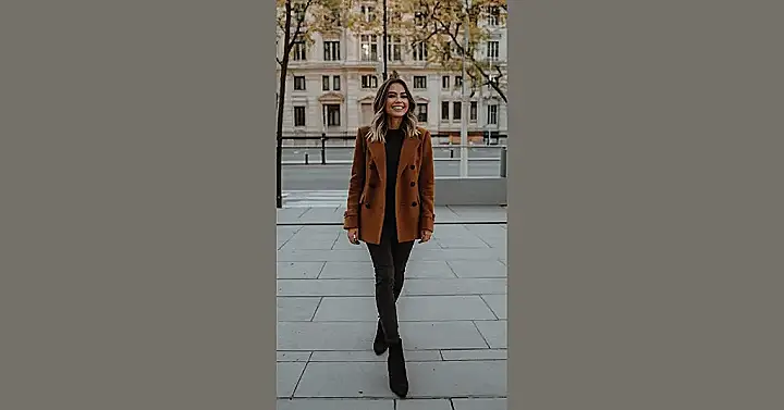 But let’s talk about the coat for a second. It’s giving “I’m a classy adult, but I still have a sense of style.” The cut is so chic, and that color? Don’t even get me started! It’s like the perfect shade of fall leaves, and it makes you feel like a queen walking around in the crisp air. This is definitely the outfit to wear when you want to feel confident and put together, but without looking like you tried too hard (because, you know, we’re all about that effortless vibe).