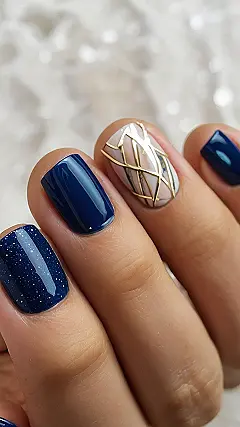 Seriously, who needs snowflakes when you’ve got *this*? The mix of dark blue, glittery blue, and that amazing gold detail is the perfect blend of sophisticated and playful. It’s like your nails are attending a super fancy winter ball, but they’re also ready to rock some snowball fights. Talk about a versatile look that’s ready for anything winter throws at you!
