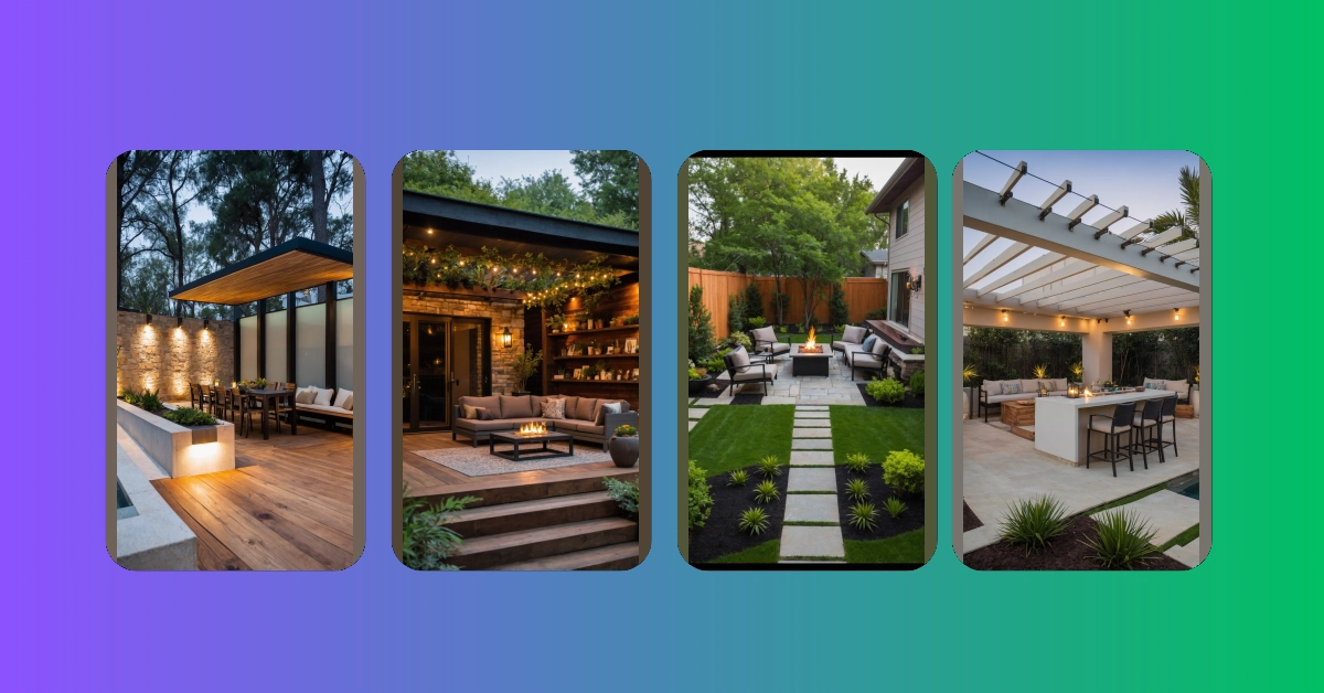 But wait, there’s more to these incredible backyard patio designs than just fire and water! Check out that seriously comfy seating; those plush cushions on the rattan sofa look like they’re practically hugging you. And that cool pergola draped with leafy vines? It’s not just pretty; it provides the perfect amount of dappled shade, so no more battling the sun with awkward squinting. This whole setup is basically begging for a movie night under the stars or a marathon board game session. It truly proves that with some clever design, your backyard can become everyone’s favorite place to unwind, relax, and make all your friends just a little bit jealous.