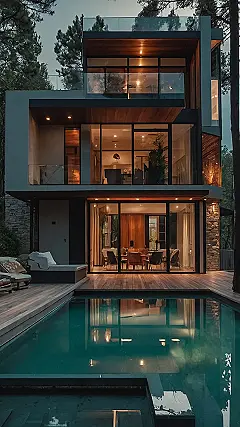 This house is a dream come true! Imagine coming home after a long day, kicking off your shoes, and stepping into this peaceful oasis. The warm glow of the lights inside makes it look like a cozy haven, and the way the water reflects the house is absolutely magical. Plus, can you imagine swimming in that pool on a hot summer day? It looks like a dream!