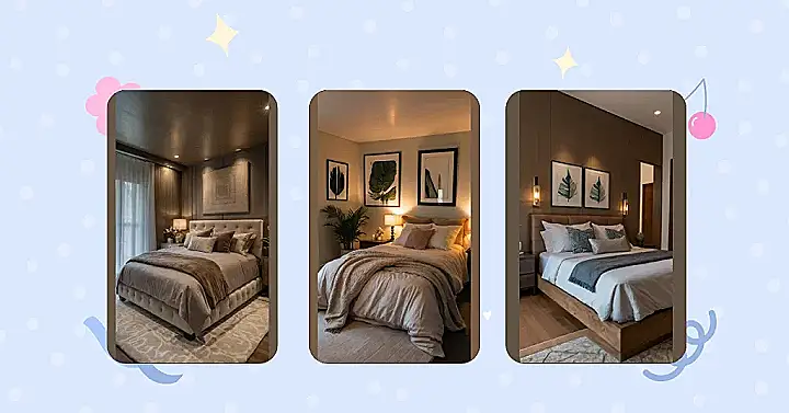 This bedroom is so chill, it’s practically whispering “shhh…relax.” Those leafy pictures on the wall look like they’re trying to blend in with the plant on the nightstand – a super sneaky attempt at a botanical takeover! But hey, even the plants seem to know this is the perfect place to unwind. It’s like a spa for your sleep, complete with soft blankets and just the right amount of cozy lighting. If only my homework could be this relaxing!