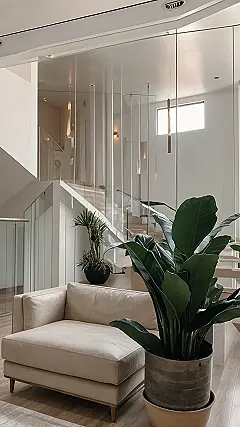 This living room is seriously giving us major “I’m so relaxed” vibes, and it’s not just because of that super comfy-looking couch! The white walls and sleek glass railings make the room feel airy and spacious, like you’re floating on a cloud. And that plant? It’s like a giant, green hug, ready to bring a little bit of nature inside. Plus, the hanging lights add a touch of modern cool, making this room a perfect example of how to be trendy without being too over-the-top.
