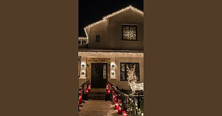 And get a load of that giant, glittery reindeer chilling right outside – it looks like it’s either ready for takeoff with Santa or just won “Best Dressed Lawn Ornament.” The pathway leading up to the front door is equally epic, lined with bright red glowing lanterns that make you feel like you’re walking a red carpet into pure holiday magic, all while keeping your feet warm from the snow, or at least pretending to. This whole outdoor display is basically a masterclass in making spirits bright, proving that a little (or a lot) of sparkle goes a long way in making Christmas unforgettable, especially when it involves a super cool reindeer friend.
