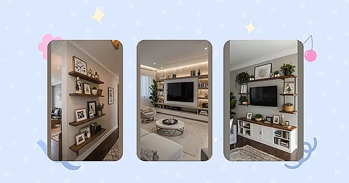 See those cool little lights glowing under each shelf? That’s the secret sauce for making your apartment feel instantly cozy, like a fancy café, but without the awkward barista staring. And peep those potted plants – they totally say, ‘I’m a responsible adult who waters things,’ even if they’re actually plastic or you sneak-attack them with a spray bottle once a week. It shows that decorating your apartment isn’t just about buying expensive stuff; it’s about adding your own cool bits and bobs, maybe even a picture of your pet looking goofy. Who knew your personality could fit so perfectly on a shelf? Just try not to block the TV with a giant rubber ducky.