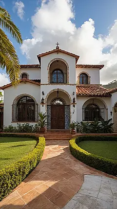 That charming path leading up to the door, flanked by perfectly trimmed hedges, makes you feel like you’re about to enter a secret garden, or maybe just a super fancy party. And check out those amazing blue and white tiles around the front door – they’re like a little art gallery before you even step inside! Each arched window and sturdy wooden door just adds to that classic, welcoming hacienda feel. You could totally picture yourself sipping a mocktail on one of those balconies, watching the clouds drift by, and pretending you’re the star of your own chill, sun-soaked movie. Who wouldn’t want to come home to a place that looks like a permanent holiday?
