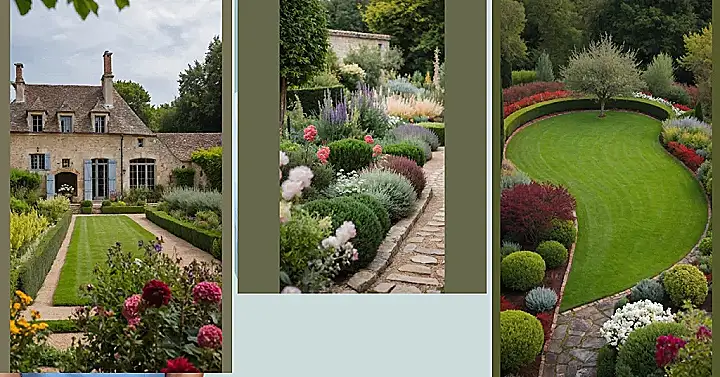 Beyond that immaculate lawn, the borders explode with a party of colors and textures, making it clear this French country garden isn’t just about the green stuff. You’ve got vibrant red shrubs competing for attention with fluffy silver-blue plants and bursts of bright white flowers, all looking like they’ve been perfectly placed by an artist – or maybe a very patient gardener with an excellent eye for drama. There’s even a cool, rustic stone path winding through it all, practically begging you to explore and maybe discover a hidden pastry chef (a French garden needs croissants, right?). It’s so beautiful, it makes you want to ditch your screen time and just soak in all that natural beauty, or at least take a thousand selfies.