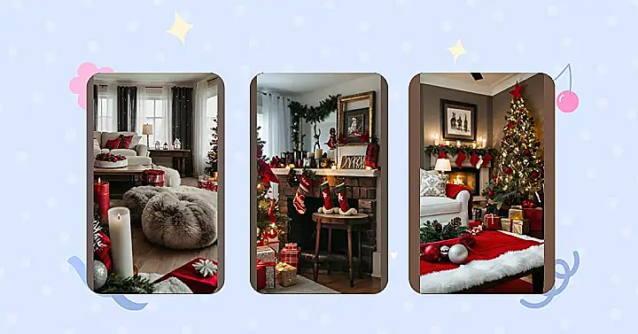 The image shows a living room that’s been transformed into a winter wonderland. It’s got all the warm and inviting feels of a classic Christmas scene. You can just picture yourself sprawled out on one of those fluffy floor pillows, a warm cup of hot chocolate in hand, while the snow falls outside. The red and white color scheme, the twinkling lights, and those fuzzy pillows make it feel like a cozy, festive haven. Plus, there’s even a Christmas tree, all decorated and ready for the holiday spirit.
