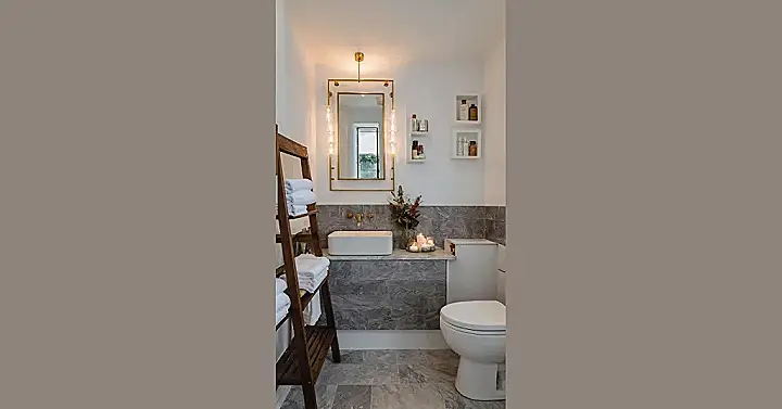 Who knew a bathroom could look this good? This isn’t just a place to get ready; it’s practically a five-star spa disguised as your everyday washroom! Just check out those super chic grey tiles; theyโre so stylish, they probably have their own Instagram. And don’t even get me started on the fluffy white towels stacked perfectly on that trendy wooden ladder โ they’re practically begging you to ditch your crusty old bath sheet for some real luxury. This room definitely screams “adulting goals” louder than your alarm clock on a Monday morning.