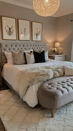 The whole vibe of this room just wraps you up like a warm hug. Kicking off your shoes onto that impossibly soft rug and sinking into the comfy bench at the end of the bed sounds like pure bliss. The beautiful light from the fancy chandelier and the lamp makes everything glow all warm and inviting, like a giant, fluffy marshmallow. It’s the kind of place where you feel totally safe and snug, like a perfectly wrapped burrito, and maybe, just maybe, homework mysteriously avoids rooms this cozy.