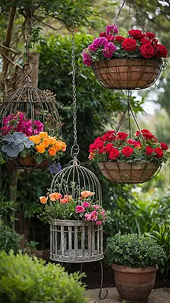 Look at these flowers, living their best life in what used to be birdcages! It’s like they staged a fancy rebellion, ditching their boring old pots for something way cooler. This is peak garden crafts, turning forgotten junk into a blooming masterpiece. Who needs a boring old bird when you can have a whole flock of colorful petals showing off? These blossoms are practically winking at you, saying, “Yeah, we’re living rent-free in a repurposed antique, what about it?”
