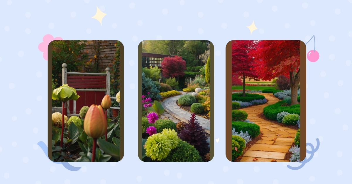 This picture is like a sneak peek into a magical autumn garden! It’s full of vibrant colors – like a mix of red, yellow, and green paint splattered on the leaves. You can almost feel the crisp autumn air as you walk on the stone path, surrounded by the changing foliage.