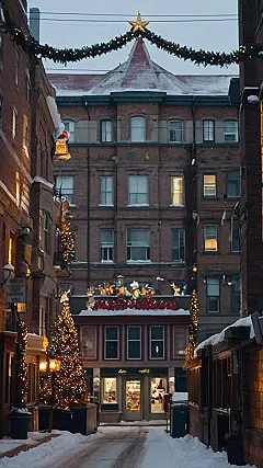 Picture this: a cozy Canadian street, all decked out for Christmas! Snow gently dusts the charming brick buildings, twinkling lights adorn every corner, and a giant star shines brightly above a festive shop. It’s like stepping into a real-life Christmas card, but way better because you can actually smell the hot chocolate and maybe even hear some carols drifting from a nearby window. Even the grumpy-looking snowmen on the rooftops seem to be smiling!