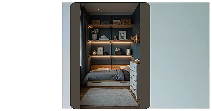 And speaking of cozy, that bed looks so inviting! With those fluffy pillows and a comfy throw blanket, it screams “relaxation.” Honestly, I wouldn’t mind spending a whole weekend just chilling there, reading a book from those super convenient shelves. It’s the perfect blend of stylish storage and a super snug sleeping space – seriously, bedroom goals!