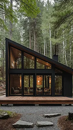 Think of it: this isn’t your grandma’s rickety old cabin, unless your grandma secretly built a super chic, super dark-paneled masterpiece in the middle of a seriously impressive forest. With those giant windows, you’d be practically hugging the trees while still being cozy enough to binge-watch your favorite shows without a single bug bothering you. It’s like the forest decided to get a glow-up, and this modern cabin is its new, totally Insta-worthy selfie, just waiting for you to escape the endless homework grind.