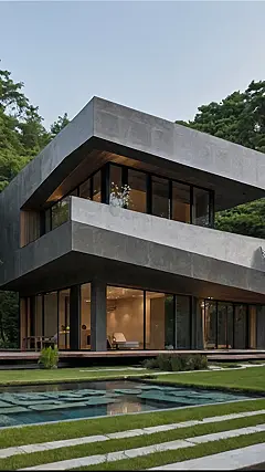 **Paragraph 1:** Imagine a house that’s like a super-stylish, concrete spaceship that landed gently in a forest! That’s pretty much what this “nature house design” is all about. It’s all sharp angles and cool gray concrete, but look closer – there are huge windows showing off the lush green trees and a peaceful little pond. It’s like the house is saying, “Hey nature, I’m cool with you hanging out; in fact, I want to show you off!” It’s proof that you can love both modern design and the amazing world outside your window.
