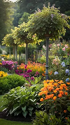 This garden isn’t just pretty; it’s like stepping into a rainbow explosion! Imagine a bunch of flowers throwing a party, all dressed in their brightest outfits. Those hanging baskets are like flower-power hats, perched on fancy little lampposts. It’s so colorful and vibrant, it makes you want to grab a picnic basket and spend the whole day surrounded by its cheerful chaos!