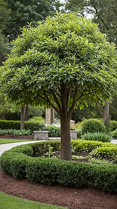 Check out this tree! It’s basically wearing a snazzy outfit around its base, thanks to some clever landscaping. Think of it like giving the bottom of your favorite plant a mini makeover. Instead of just sad, bare dirt, someone added a neat little green hedge border and some fluffy mulch carpet. It totally makes the tree look more put-together, like it just got ready for a fancy garden party and wants its “feet” to look their best for all the worms and beetles wandering by. Who knew trees cared so much about fashion?