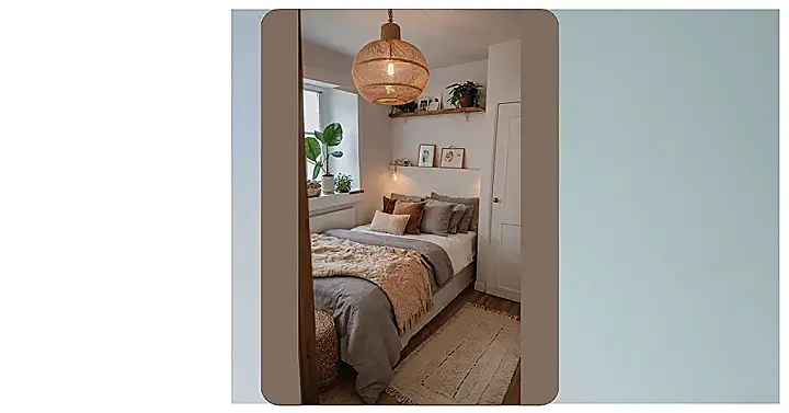 And check out that awesome light fixture! It looks like a giant, super cool wicker basket got a job as a chandelier – very stylish. With all those warm, glowy lights and leafy green roommates chilling on the shelves and windowsill, this room is basically a zen garden but with Wi-Fi and snacks. It’s the perfect hideout for plotting world domination, binge-watching your favorite shows, or just enjoying the sweet, sweet peace of not having to share your space. A single bedroom this epic makes a castle seem overrated!