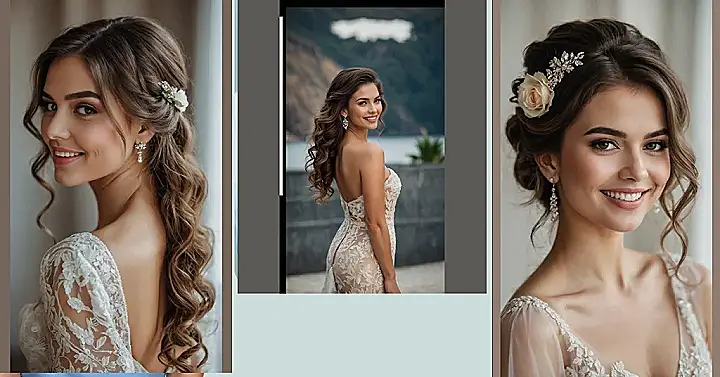 And let’s be real, those curls are totally living their best life, flowing down like a waterfall of awesome. Peeking out from the side is a super cute floral hair accessory that makes her look like she just stepped out of a fancy storybook, especially with that amazing lace dress. This kind of loose, wavy hair style makes her smile shine even brighter, showing everyone that wedding hair can be both super elegant and totally fun. It’s definitely the kind of look that says, “I’m about to say ‘I do,’ and my hair is looking just as fabulous as I feel!”
