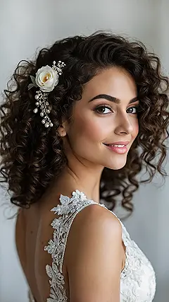 And seriously, naturally curly hair is the best canvas for all the fun bridal hair stuff you see in pictures like this one. Those gorgeous white roses and sparkly crystal clips? They just snuggle right into the curls and stay put, making you look like you stepped out of a fairytale. Trying to get delicate accessories to stay in slick, straight hair can be a mission, but curls hold onto things like a champ. So, let your hair be gloriously curly, add some bling, and get ready to have the most fabulous, bouncy bridal look ever.