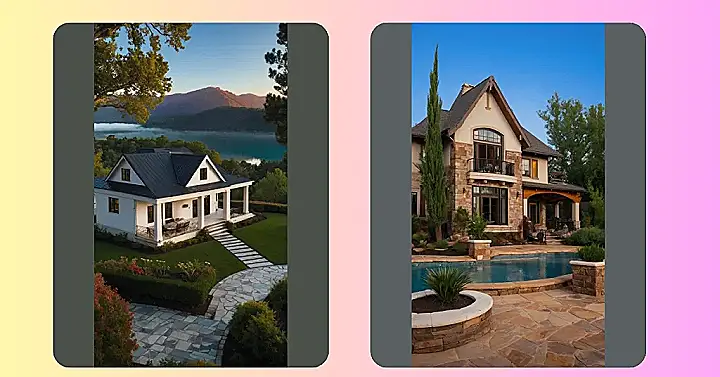 This house is like something out of a fairytale! It’s nestled in the mountains, with a big, lush lawn and beautiful pink flowers. It looks like the perfect place to relax and enjoy the scenery, maybe with a cup of hot chocolate and a good book. Imagine waking up to the sound of birds chirping and the fresh mountain air. This house definitely gives us major “cozy cabin vibes,” and who wouldn’t want to live in a cute house like this?