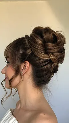 That hairstyle is seriously stunning! It’s like a perfectly sculpted cloud of gorgeous brown hair, all twisted and turned into a sophisticated bun. Imagine rocking this look on your wedding day – you’d be the most elegant person in the room, maybe even the whole state! It’s totally a “French Twist Wedding Hair” dream come true, and way more exciting than a boring old ponytail, right? This sophisticated updo is the perfect blend of chic and classic, and it looks so effortless – even though we know it probably took a pro to achieve this masterpiece.