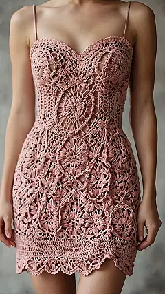 Get ready to ditch the basic tees, because this crochet-inspired dress just walked in and stole the show! It’s like someone took all the cool, intricate patterns from your aunt’s fancy tablecloths and magically turned them into a super trendy outfit. Imagine the skill it takes to hook all those pretty loops into a masterpiece like this – probably more patience than trying to untangle your headphone wires! This dress is definitely not playing it safe; it’s practically winking at you with all those unique textures and sweet, rosy color.