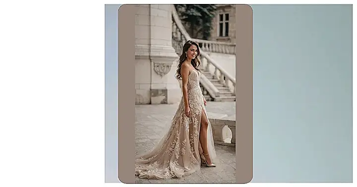 The moment you put on a dress like this, you just know it’s going to be a good day. Our model here looks absolutely radiant in what we’re calling a ‘gold wedding dress’ – not the super blingy kind, but the elegant kind that shimmers with a soft, golden hue, making her look like a real-life trophy. With all that delicate lace, it’s like a fairy had a major crafting session, making sure every stitch was pure perfection and totally ready for its big red carpet moment.