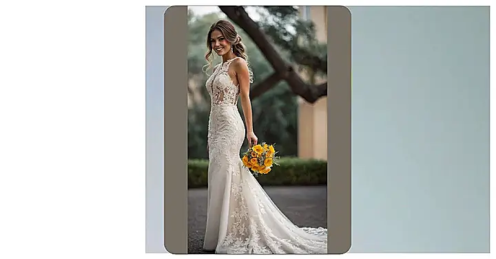 Forget all those boring dresses you’ve seen; this one is practically screaming ‘top wedding dress of the year!’ Just look at that intricate lace on the bodice – it’s so fancy, it probably took a team of tiny, super-skilled fashion elves to create. And that flowing skirt? It looks so light and dreamy, you’d swear she’s about to float off into the beautiful sunny background. This is definitely the kind of gown that makes everyone stop scrolling and say, “Whoa, where do I get one of those?”