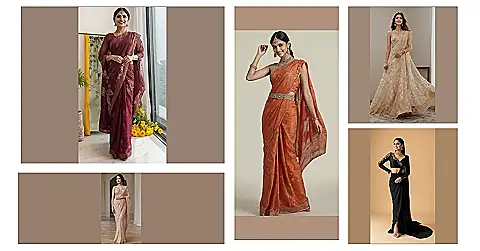 Stepping out in this maroon saree would definitely make heads turn! With its dazzling golden embroidery, it looks like someone sprinkled magic dust all over the fabric, making it shimmer and shine. It’s the kind of outfit that instantly boosts your confidence, making you feel ready to conquer anything, even if your biggest challenge is just deciding what to watch next. And let’s be real, the sheer, elegant saree blouse with those long sleeves isn’t just a supporting character; it’s totally stealing the spotlight, tying the whole look together with major style points.