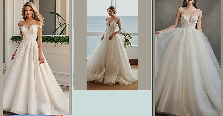 Planning a wedding? Picking a dress is like choosing your spirit animal, but way fancier! Check out this dreamy long dress. It’s got sleeves with lace that look like they were drawn by fairies, and the skirt? Total princess vibes. Just imagine twirling around in that thing during your first dance – you’ll be the star of your own rom-com!