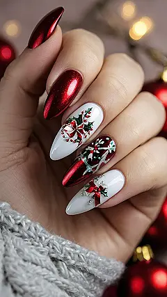 Forget ugly Christmas sweaters – these nails are the new statement piece for the season! The red and white is super classic, but those little sparkly details make them extra special. It’s like the nail equivalent of a perfectly decorated Christmas tree, all mini and gorgeous on your hands. You can even try to recreate this look yourself – it’s surprisingly simple to do with some nail polish and a little bit of festive creativity!