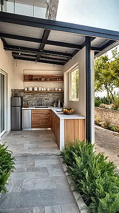 Who needs a giant mansion when you can have this slice of paradise right outside? This spot is basically telling your indoor kitchen, “Bye, Felicia!” because everything you need for a killer outdoor party is right here. Imagine whipping up snacks or grilling burgers without missing a single sunny moment. You’ve got a fridge for your secret stash of cold drinks and a counter that’s perfect for all your fruit-bowl masterpieces. Plus, with the lush green shrubs right there, you’re practically cooking in a mini jungle, but way less buggy and much more stylish!
