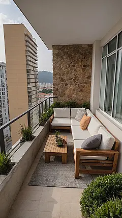 This isn’t just any balcony; it’s a masterclass in making a small space feel like a five-star resort! The awesome stone accent wall gives it a totally unique vibe, like you’ve got your own mini-mountain lodge perched high above the city. And check out those plants – they’re not just for decoration, they’re probably busy trying to convince you to start a secret garden club. With that cozy rug and those comfy pillows, you’ll be hosting epic study breaks (or just epic breaks from studying) with your friends. Warning: your friends might start ‘accidentally’ showing up at your place more often, just to ‘borrow a cup of sugar’ and then magically end up on your super cool balcony!
