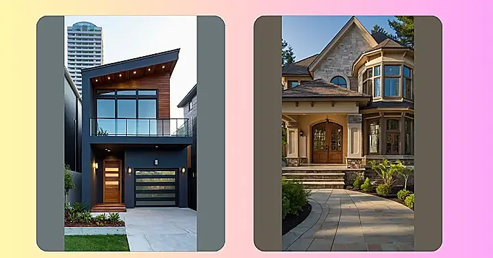 This house is playing peek-a-boo with the whole “traditional” thing! It’s like it’s saying, “Yeah, I have a door and windows and stuff, but I’m gonna slant the roof and throw in a balcony just to keep things interesting!” It’s not your grandma’s cottage, that’s for sure, but it still has some classic vibes hiding in that sleek design.