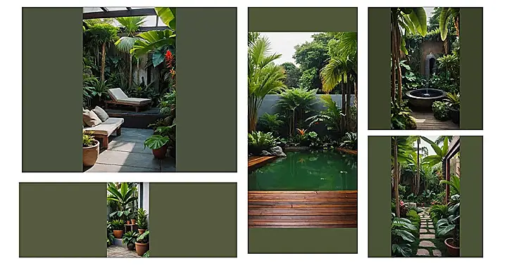 This picture is like stepping into a mini jungle! It’s a small tropical garden, but it’s packed with lush green plants, a cool pool, and even a little wooden bridge. Imagine chilling out here on a hot day, taking a dip in the pool and feeling the cool water all around you. It’s like your own little piece of paradise, even if it’s not a whole rainforest!