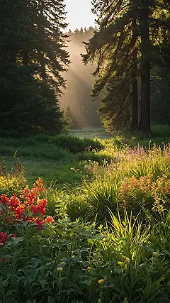 Are your actual windows currently showing off a brick wall, your neighbor’s suspiciously tall hedge, or perhaps just the endless grey of a rainy day? Well, ditch the dullness and say hello to this absolute stunner! This picture, with its majestic trees reaching for the sunbeams peeking through like nature’s own spotlight, and those vibrant red and purple flowers popping against the green, looks like it’s straight out of a fantasy movie. Why settle for reality when your wall can pull a disappearing act and become a magical forest, complete with sunlight that might just trick you into thinking you need sunglasses indoors?
