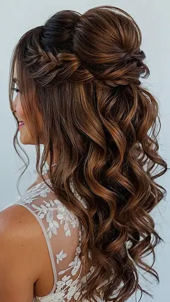 Weddings are a canvas for creativity, and your hairstyle should reflect your unique personality and love story. For those looking to strike a balance between elegance and playfulness, a half up half down hairstyle offers the perfect solution. One stunning option features intricately twisted or braided sections that frame the face, allowing soft waves to cascade down your back. For added charm and whimsy, incorporate delicate floral accents or sparkling hairpins that catch the light, harmonizing beautifully with your bridal ensemble and enhancing the overall romantic ambiance of the day.