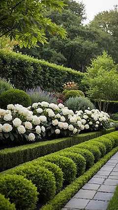 Walking through here would be like getting an instant chill pill. Forget stressing about homework, just breathe in the super fresh green air and enjoy the crisp white blooms. It’s the kind of place where you could totally just wander, pretending you’re in a movie or maybe just appreciating how nice things can be when nature and smart design team up. With the big trees towering in the background and that path leading you somewhere cool, it feels like a little escape hatch into a peaceful world, perfect for just hanging out and letting your brain take a mini-vacation.