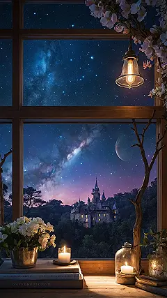 Check out this absolutely epic view! It’s like the universe decided to throw a gigantic party right outside, complete with a dazzling galaxy light show, a gazillion twinkling stars, and a sleepy crescent moon just hanging out. And if that wasn’t enough to make you pinch yourself, there’s a whole fairytale castle nestled among the trees, probably where someone important is wondering if their pet dragon needs a snack. This isn’t just a window; it’s practically a portal to a land where dreams come true, but with less actual portal-jumping and more chill vibes.