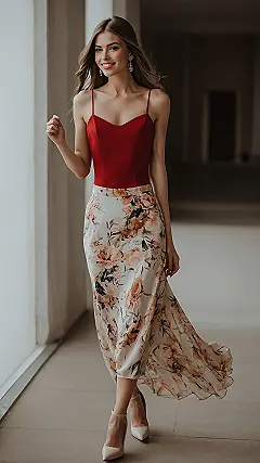 Wow, this outfit is basically saying, “I woke up like this, but also spent an hour perfecting it.” The red top is giving off major confidence vibes, like it’s ready to take on the world or maybe just ace that pop quiz. And that floral skirt? It looks like a whole garden party decided to crash a fashion show, but in the best way possible, making this a truly chic look that screams fun and fancy all at once.