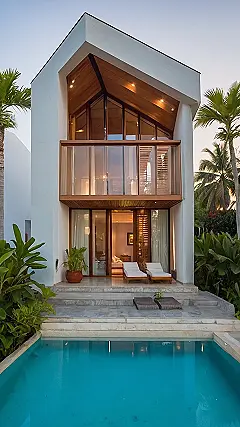 Imagine you’re designing your dream resort. This place looks like it’s got it all! The designers were probably thinking, “Let’s build a fancy treehouse for grown-ups!” I mean, look at that peaked roof and all the glass! Plus, you’ve got your own private swimming pool just steps from your room. No need to worry about fighting for a lounge chair by the main pool – you can just roll out of bed and cannonball into your own turquoise paradise.